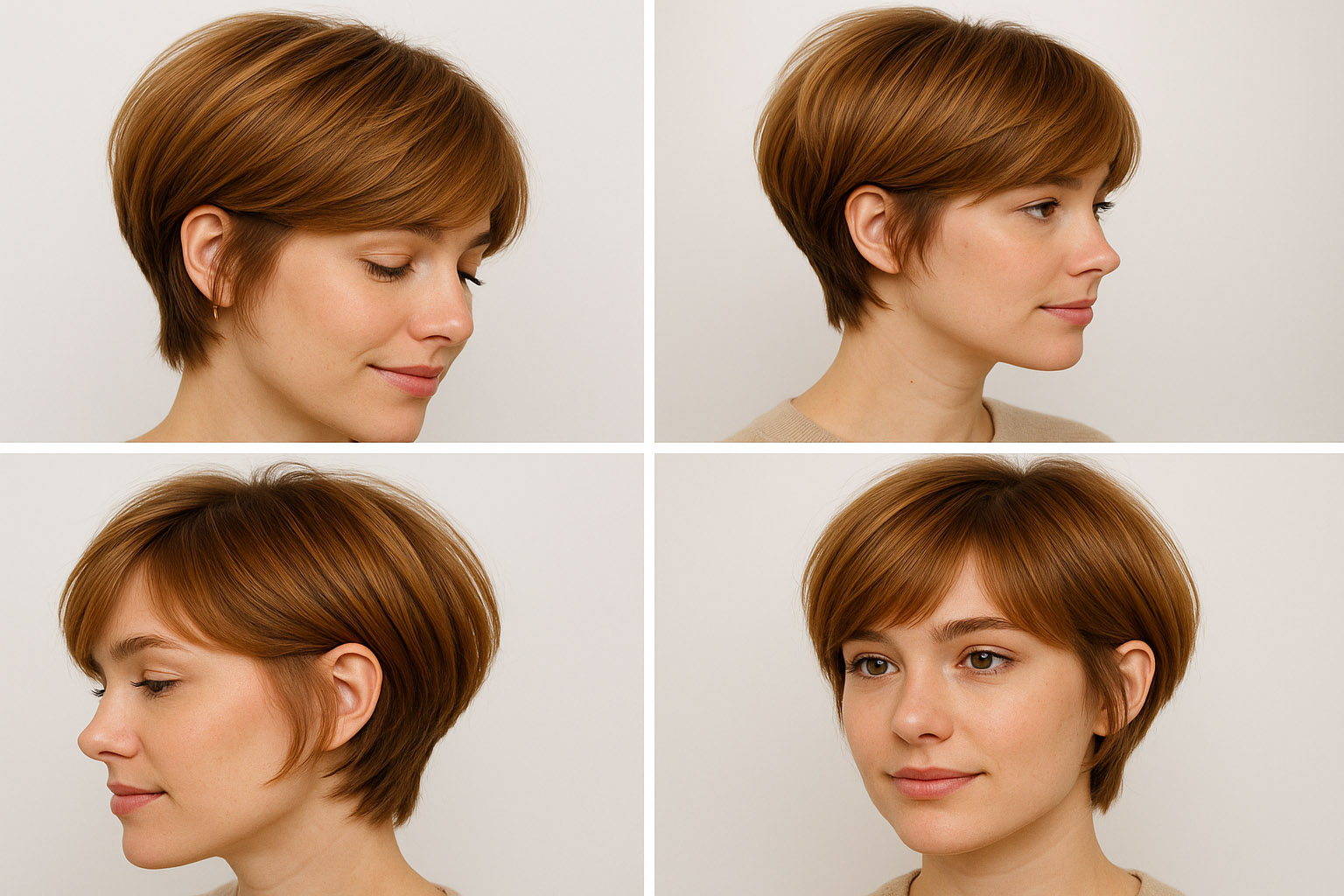 “Kısa ense, katmanlı tepe, yumuşak yan geçişler ve perde/yan süpürülmüş kahkül. Renkte gölge kök, uçlarda bal ve karamel ışıltılar.”
